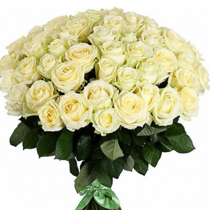 Букет состоит из 51 белая роза, прозрачная упаковка, атласная лента.
