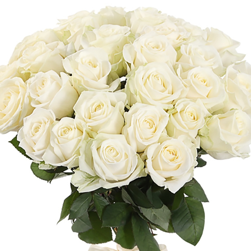 Букет состоит из 35 белых роз, прозрачная упаковка, атласная лента.