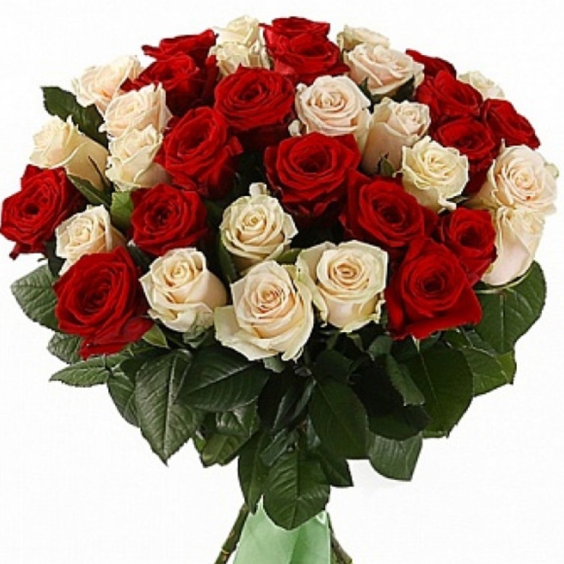 Букет состоит из 51 красная и белая роза, прозрачная упаковка, красная и белая лента.