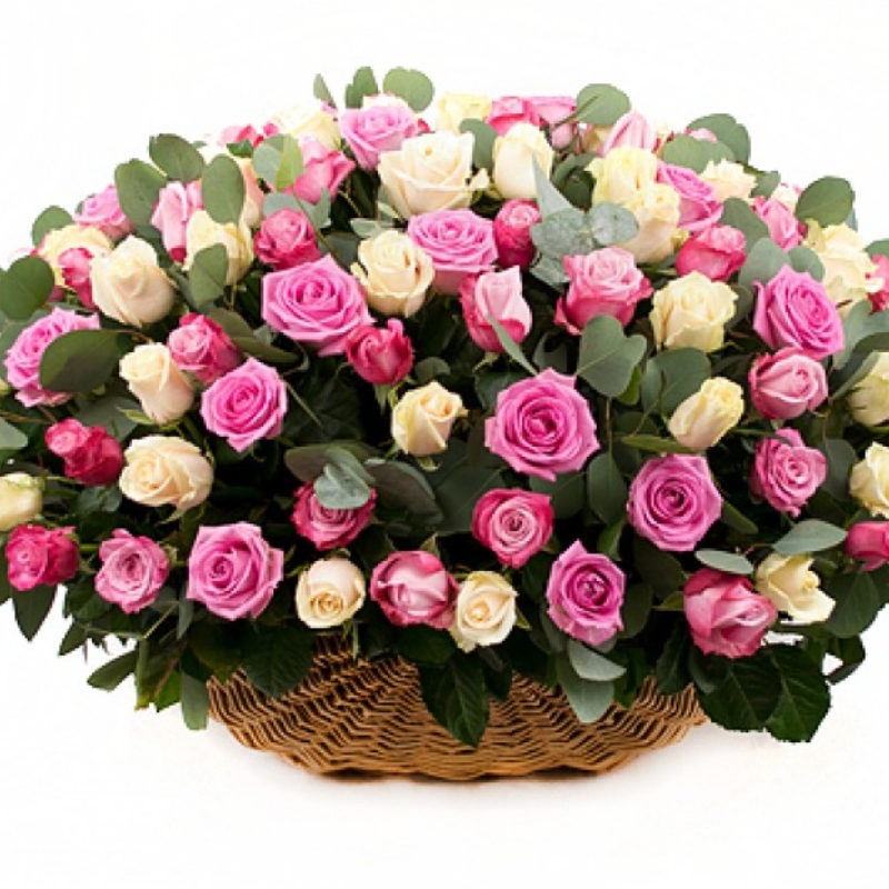 Букет состоит из 50 белых роз, 51 розовая роза, зелень, корзина.