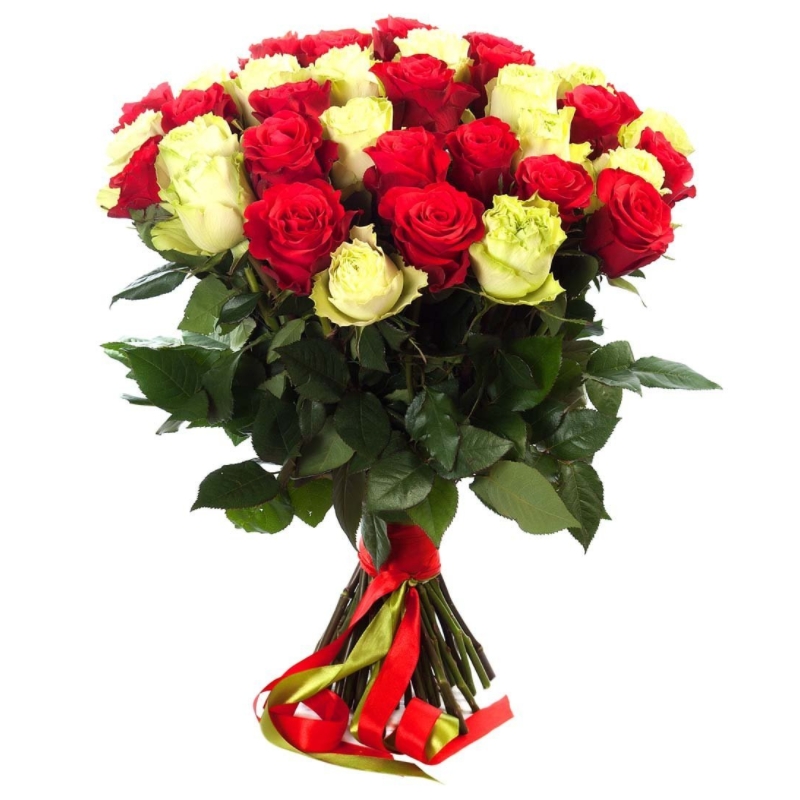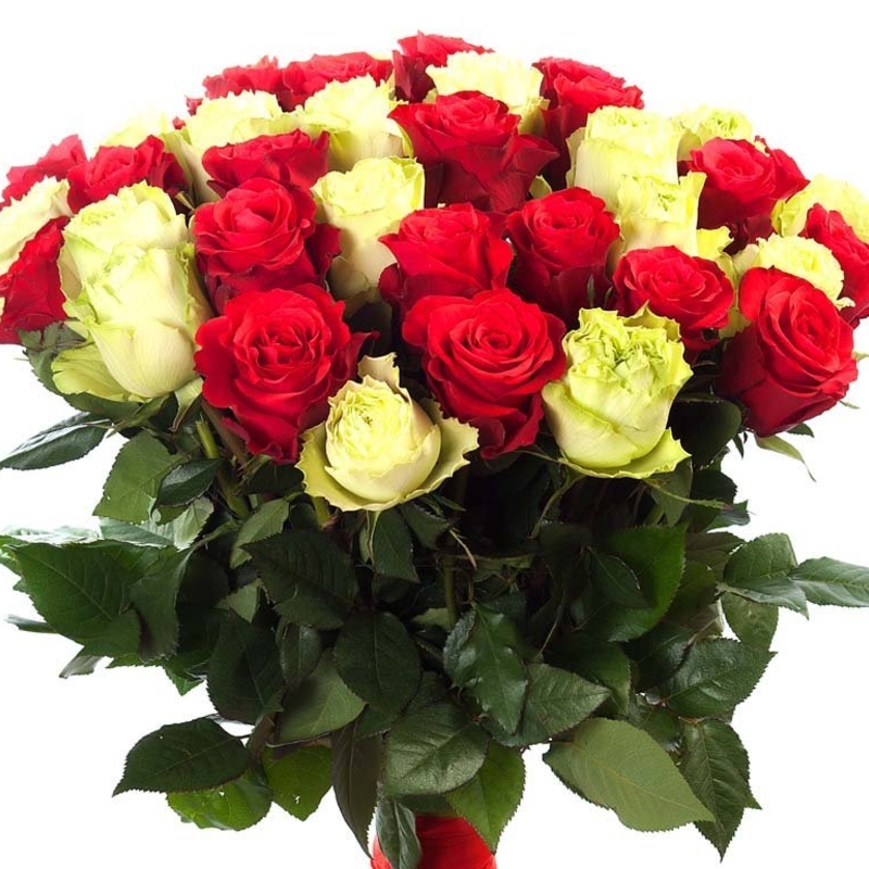 Букет состоит из 23 красные розы, 22 белые розы, прозрачная упаковка, атласная лента.