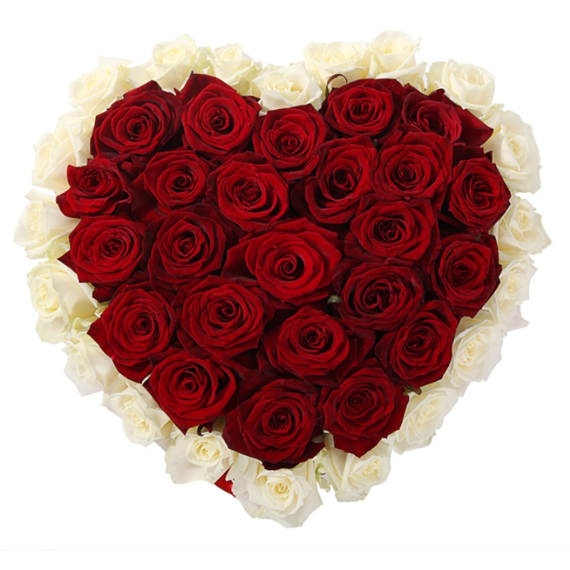 25 красных роз, 20 белых роз, коробка в виде сердца, атласная лента.