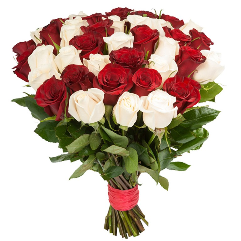 Букет состоит из 23 красные розы, 22 белые розы, прозрачная упаковка, атласная лента.