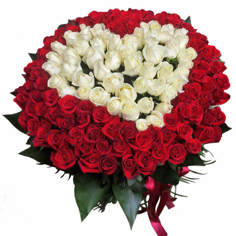 Букет состоит из 101 красная и белая роза, прозрачная упаковка, атласная лента.