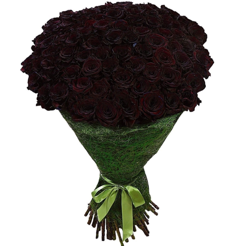 Букет состоит из 101 темно - бордовая роза, сизаль, атласная лента.