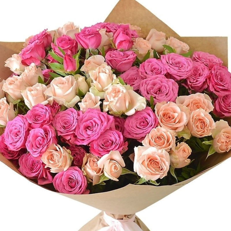 Букет состоит из 14 веток розовой кустовой розы, 11 веток кремовой кустовой розы, крафт, розовая лента.