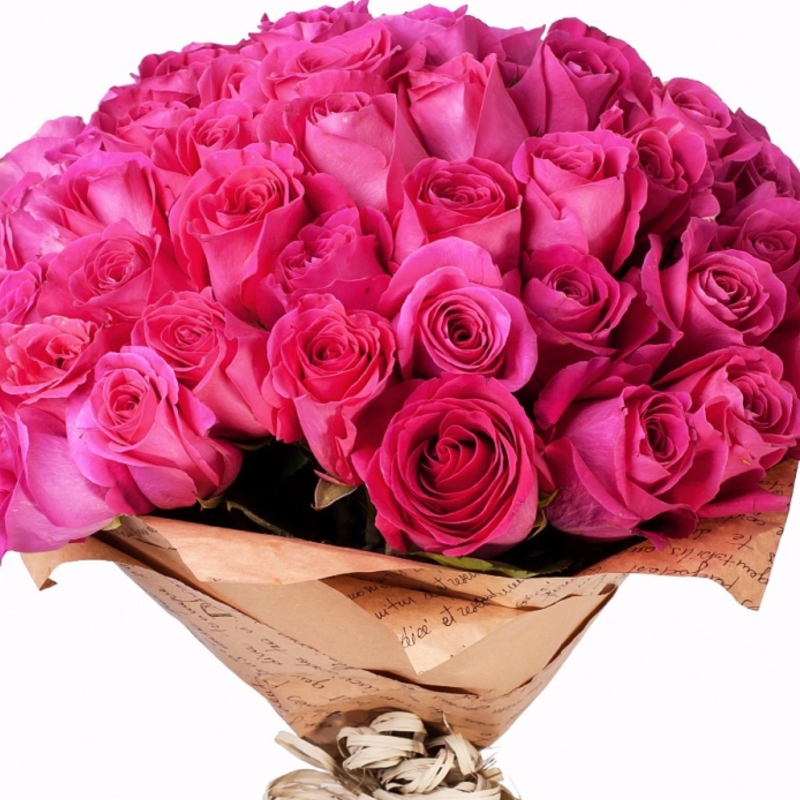 Букет состоит из 51 малиновая роза, крафт, атласная лента.