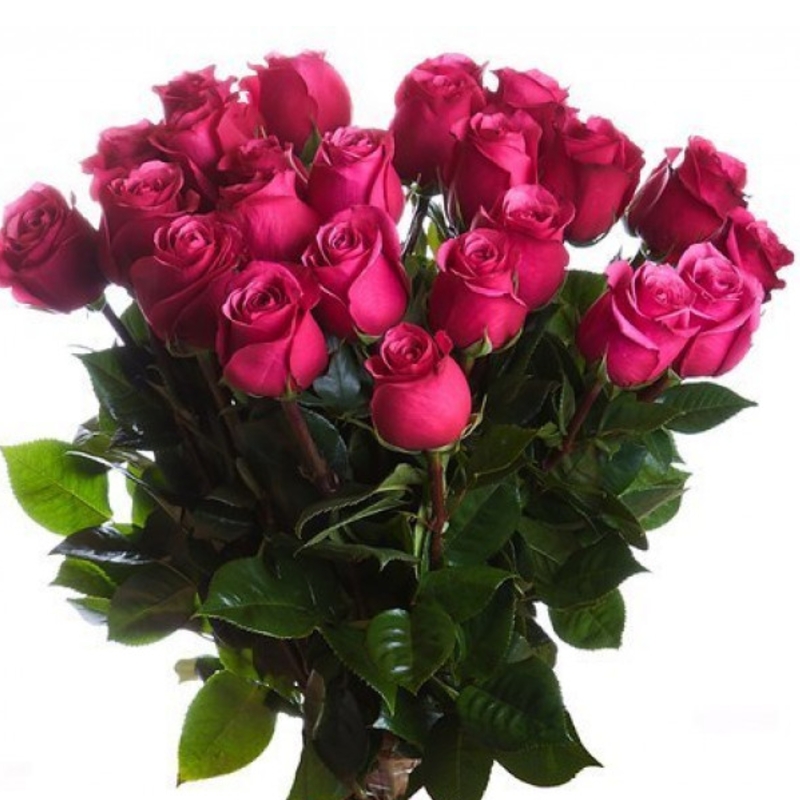 Букет состоит из 21 малиновая роза, прозрачная упаковка, атласная лента.