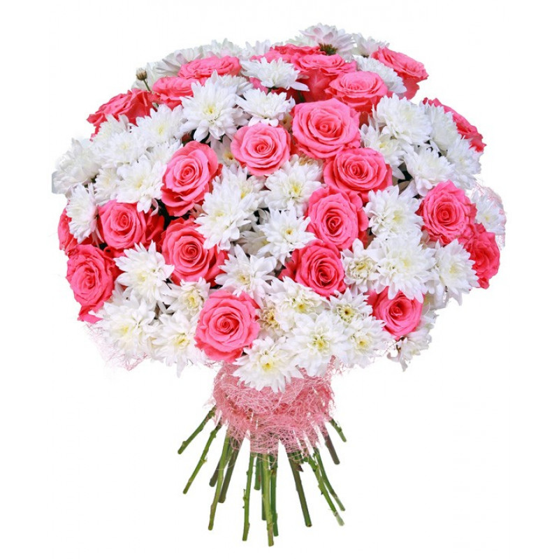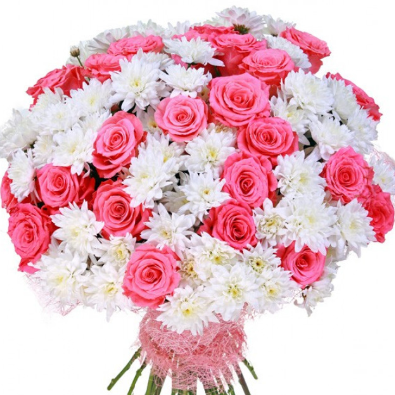 Букет состоит из 25 розовых роз, 24 ветки белой хризантемы, розовая упаковка, атласная лента.