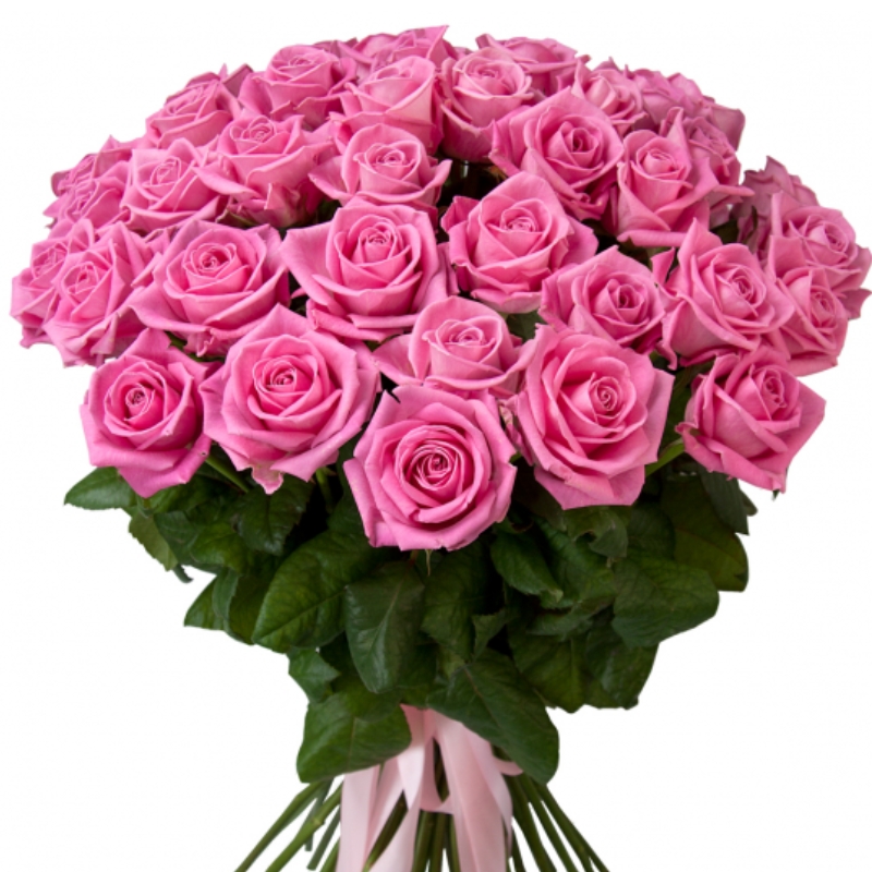Букет состоит из 55 розовых роз, прозрачная упаковка, атласная лента.