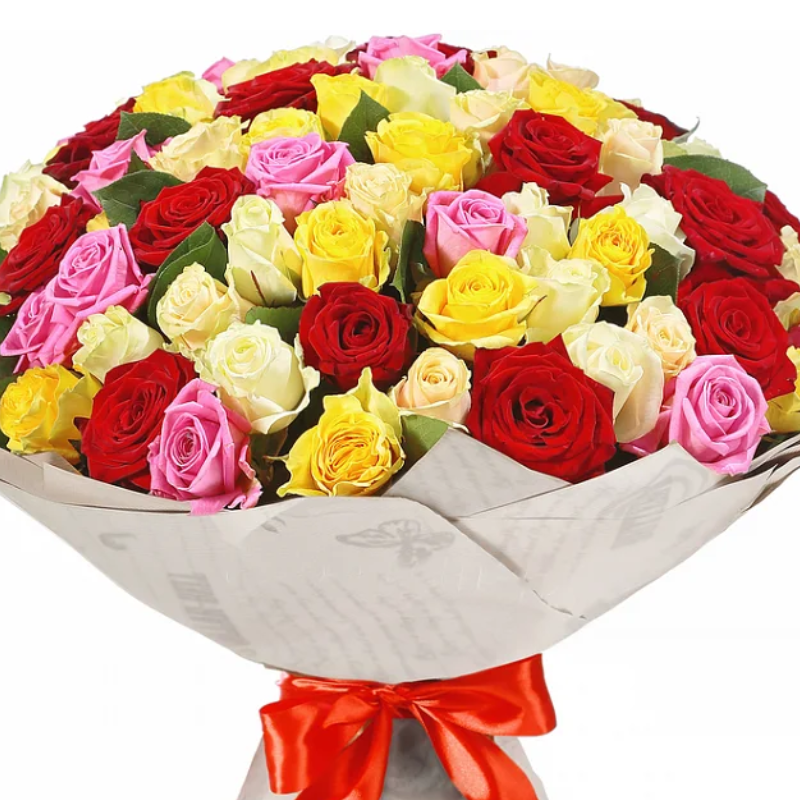 Букет состоит из MIX из 101 желтой / красной / белой / розовой розы, красивая упаковка, лента.