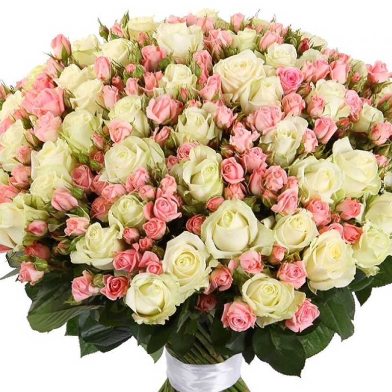 Букет состоит из 71 белая роз, 30 розовых кустовых роз, прозрачная упаковка, атласная лента.