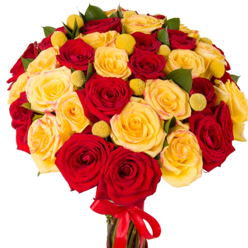 Букет состоит из 23 красные розы, 22 желтые розы, 11 желтая краспедия, прозрачная упаковка, атласная лента.