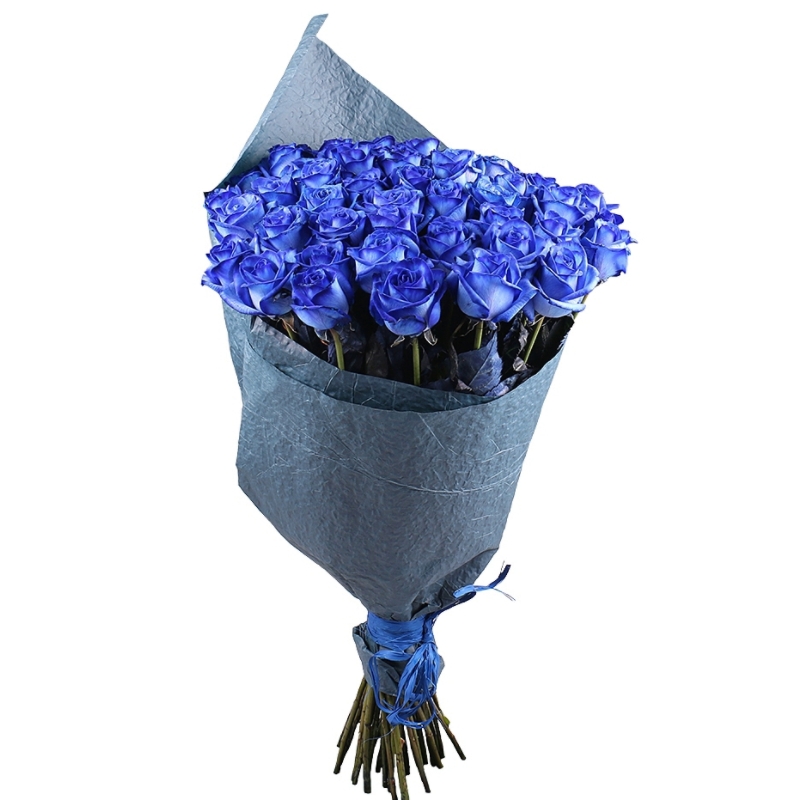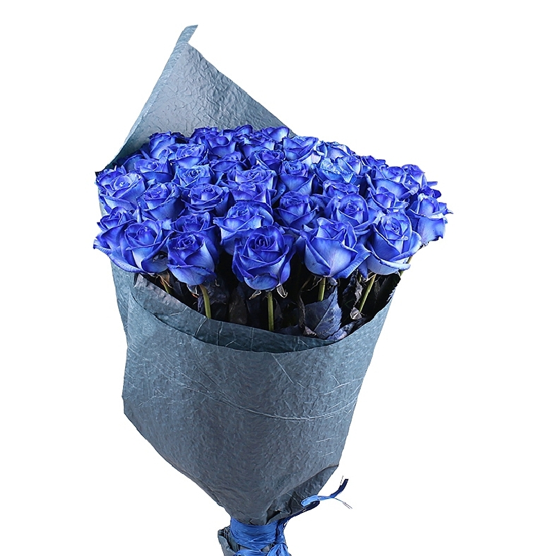 Букет состоит из 51 синяя роза, крафт, атласная лента.