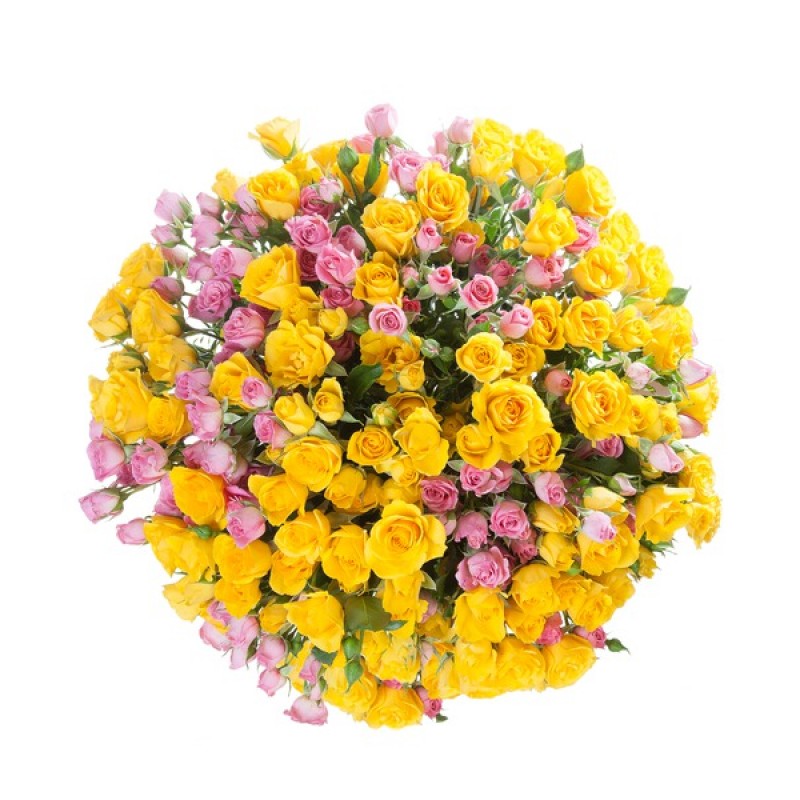 Букет состоит из 26 розовых кустовых роз, 25 желтых кустовых роз, прозрачная упаковка, атласная лента.