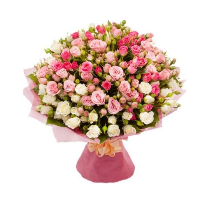 Букет состоит из 51 ветка белой и розовой кустовой розы, красивая упаковка.