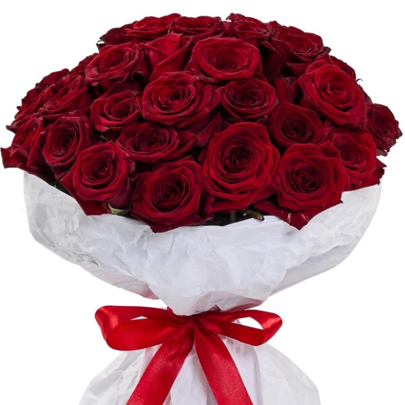 Букет состоит из 55 красных роз, белая упаковка, атласная лента.