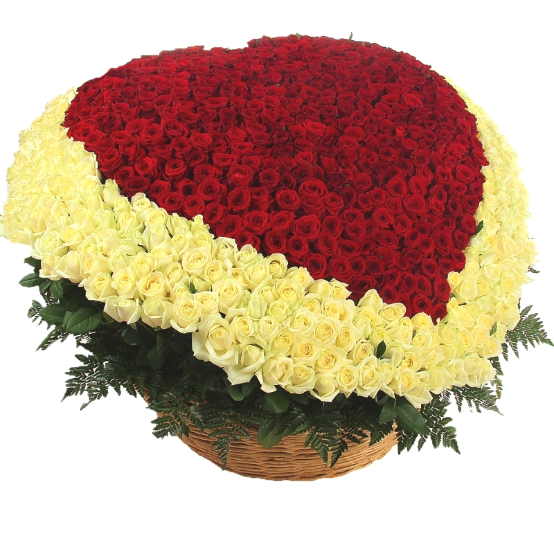 Сердце из 501 красной и белой розы в корзине
