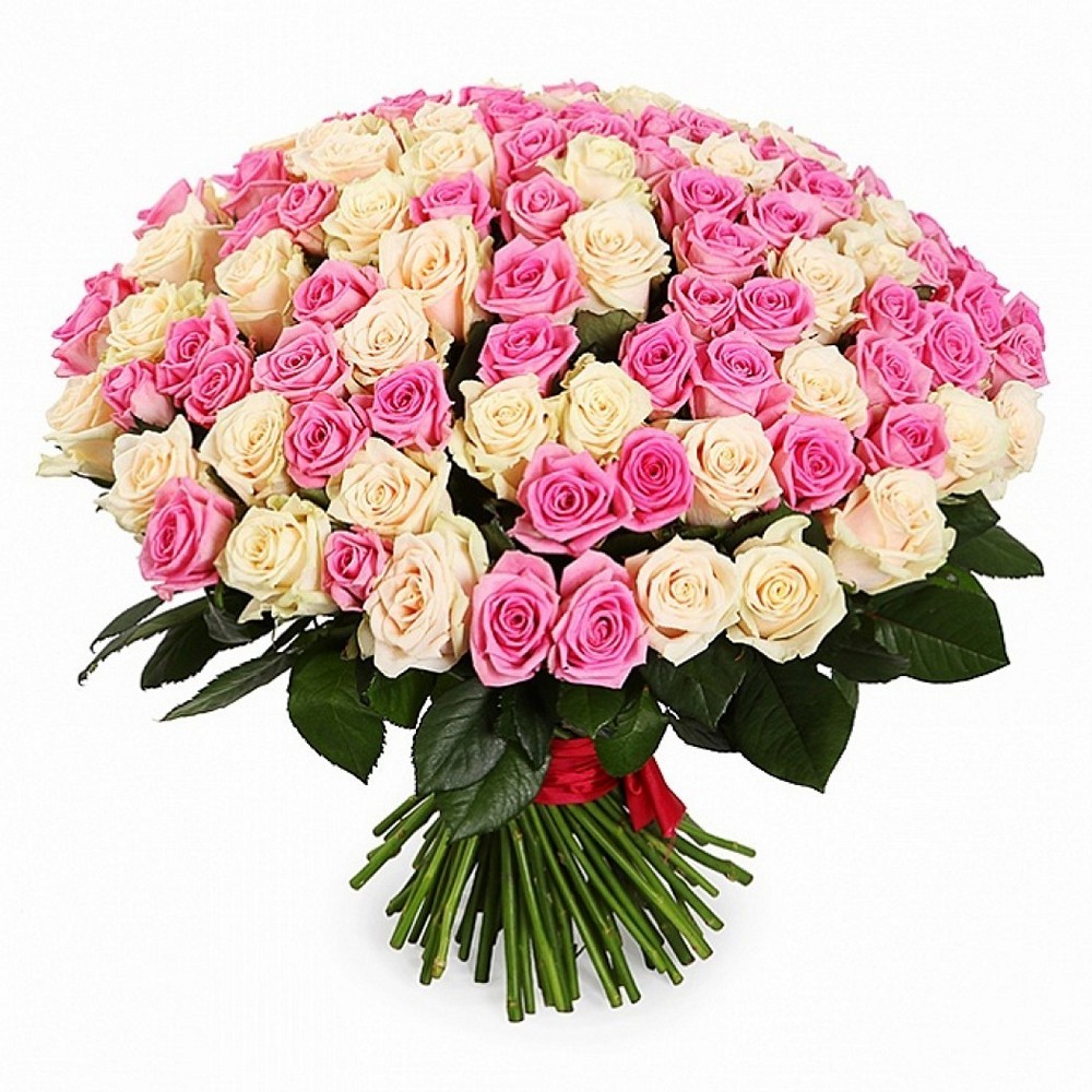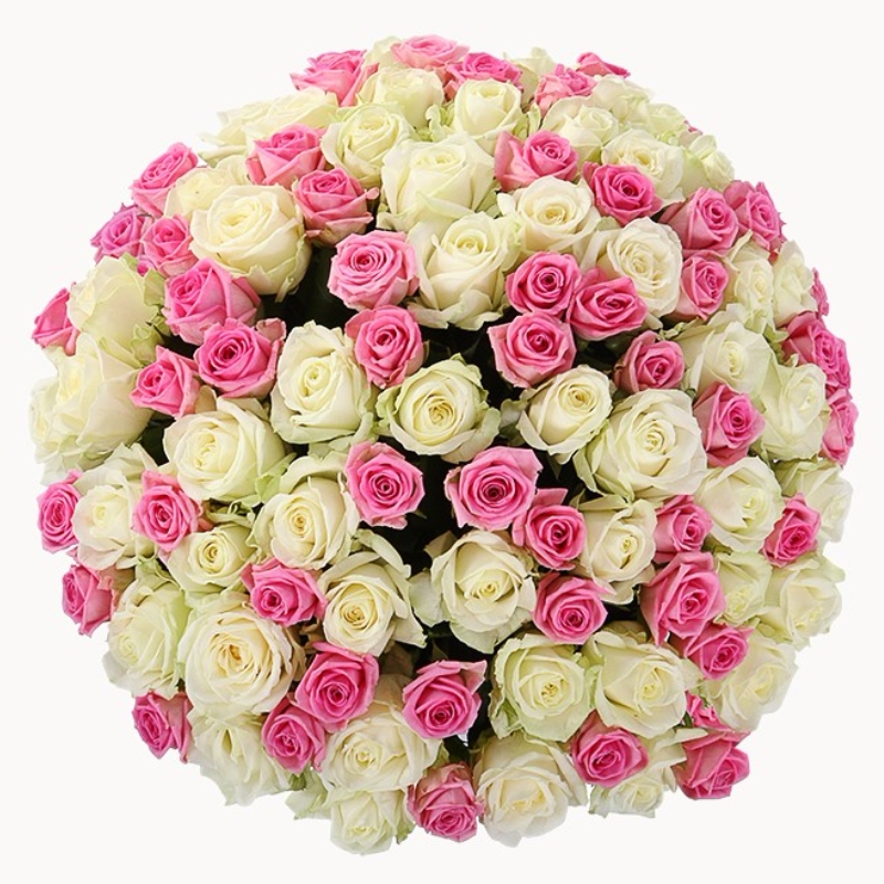 Букет состоит из 76 белых роз, 75 розовых роз, прозрачная упаковка, розовая и белая лента.