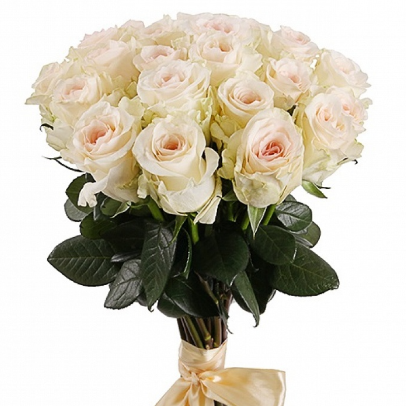 Букет состоит из 21 кремовая роза, прозрачная упаковка, атласная лента.