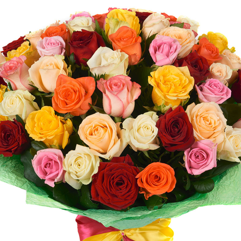 Букет состоит из MIX из 51 желтой / красной / кремовой / белой / розовой и коралловой розы, красивая упаковка.