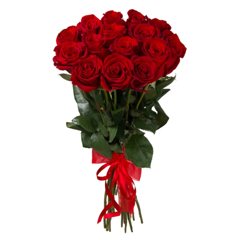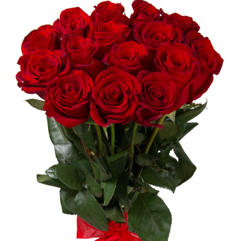 Букет состоит из 17 красных роз, прозрачная упаковка, атласная лента.