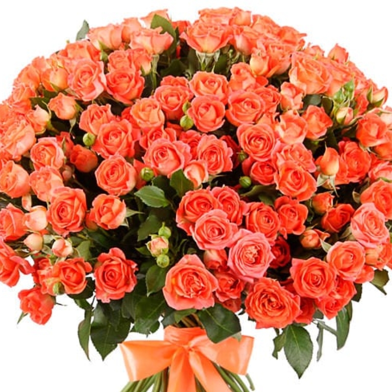 Букет состоит из 45 оранжевых кустовых роз, прозрачная упаковка, атласная лента.