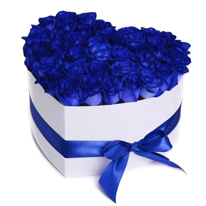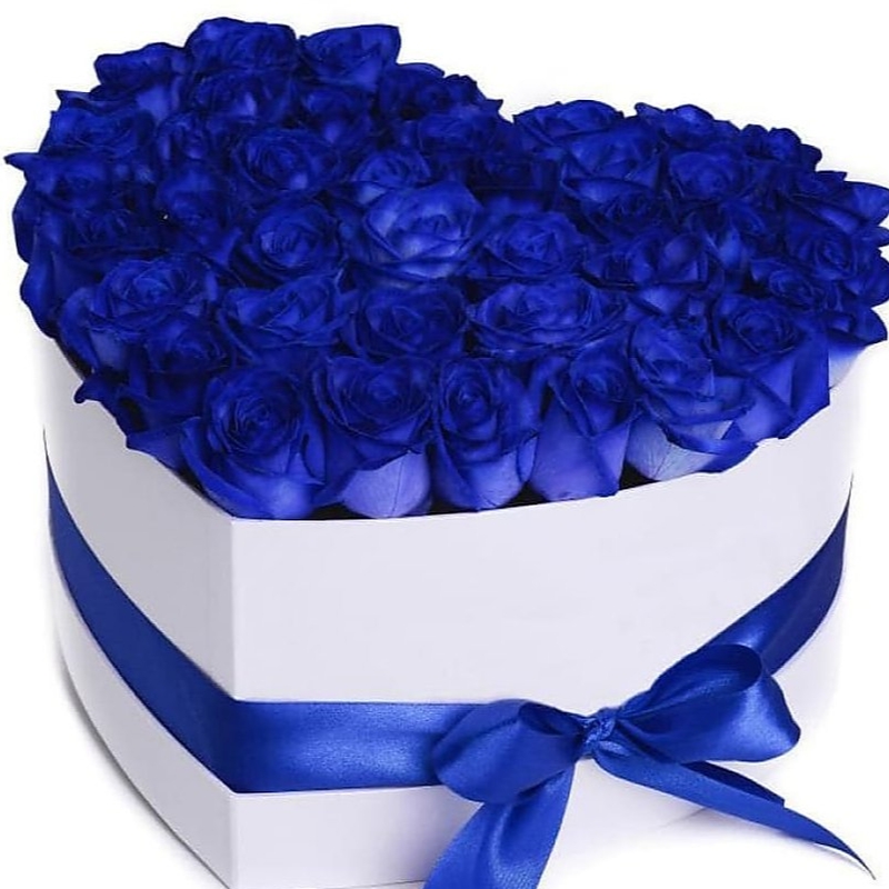 Букет состоит из 45 синих роз, коробка, оазис, атласная лента.