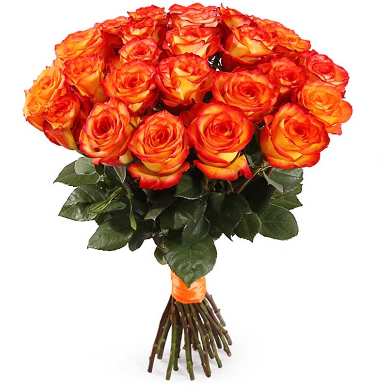 Букет состоит из 25 оранжевых роз, прозрачная упаковка, атласная лента.
