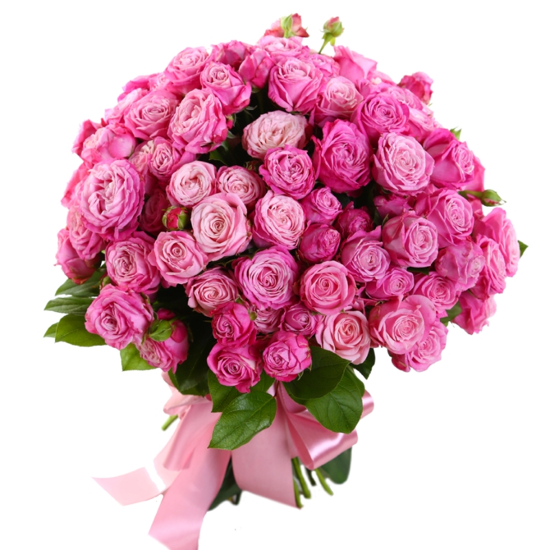 Букет состоит из 25 кустовых пионовидных роз, прозрачная упаковка, атласная лента.