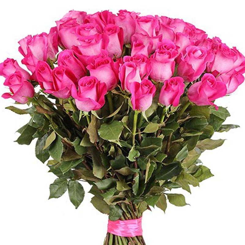 Букет состоит из 35 малиновых роз, прозрачная упаковка, атласная лента.