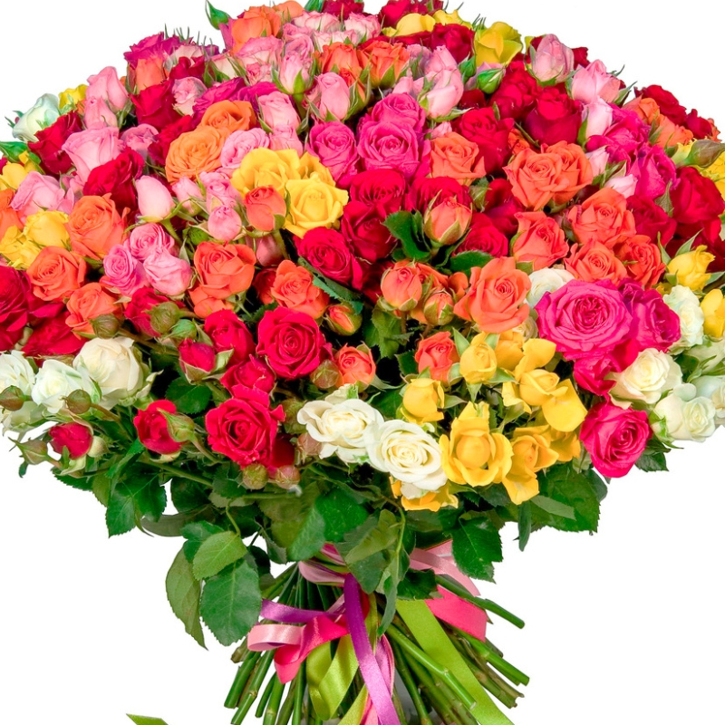 Букет состоит из MIX из 101 кустовой розы, прозрачная упаковка, атласная лента.