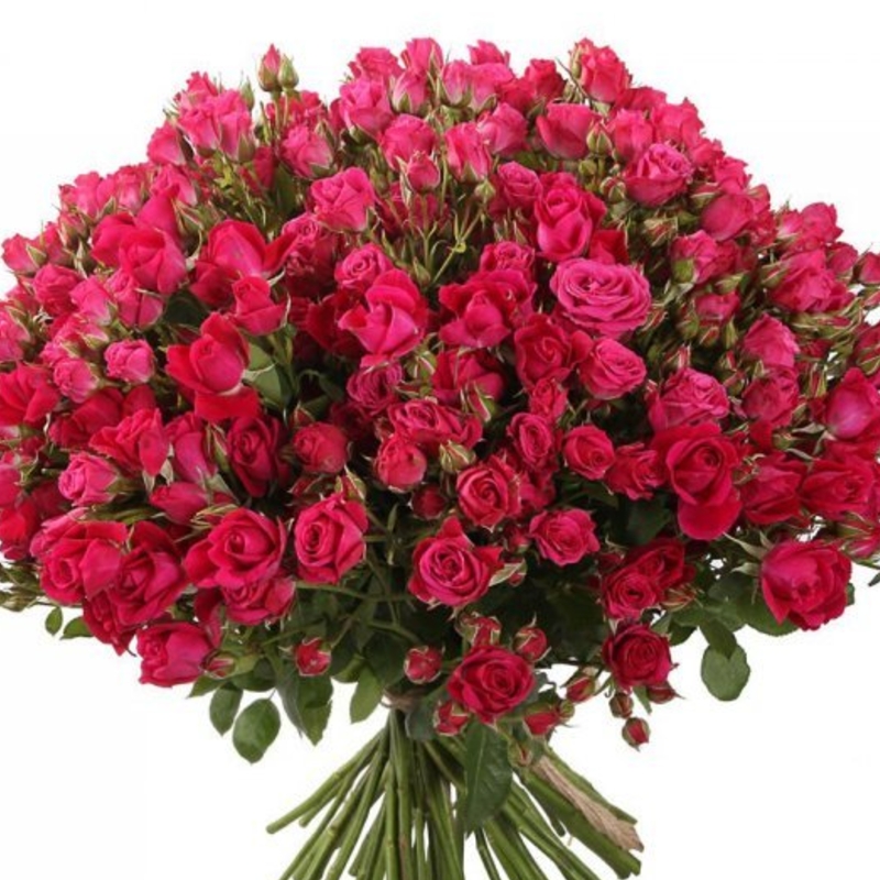 Букет состоит из 55 кустовых малиновых роз, прозрачная упаковка, атласная лента.