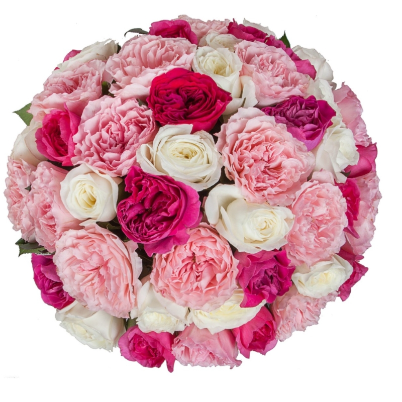 Букет состоит из MIX из 45 пионовидных роз, прозрачная упаковка, атласная лента.