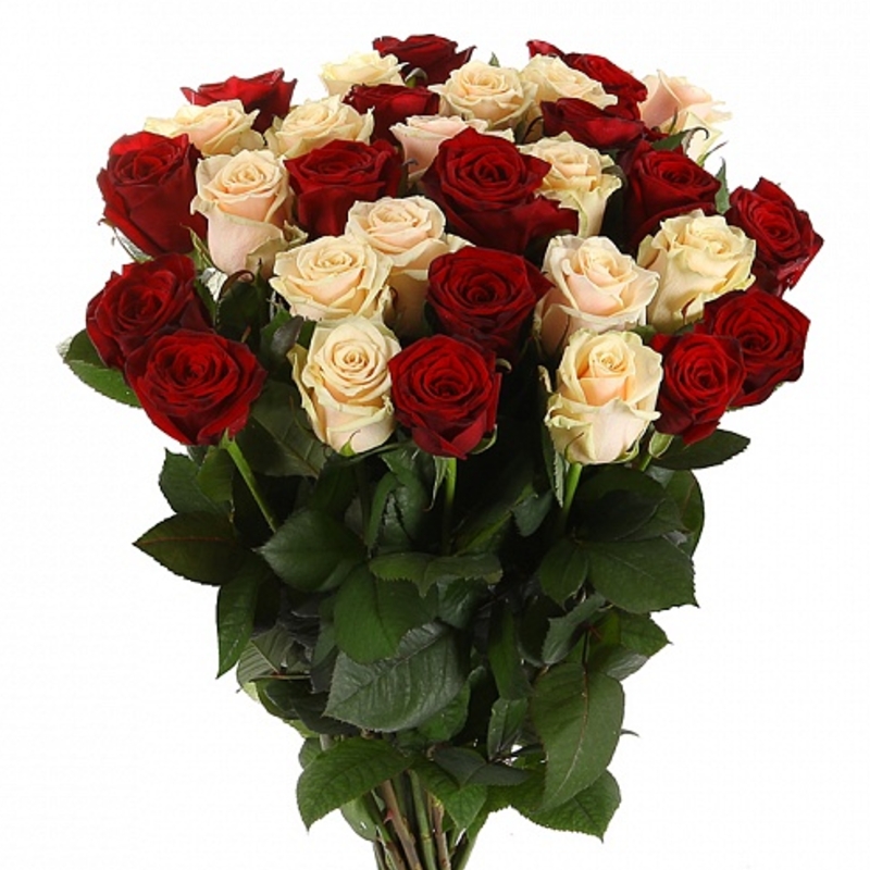 Букет состоит из 16 красных роз, 15 кремовых роз, прозрачная упаковка, атласная лента.