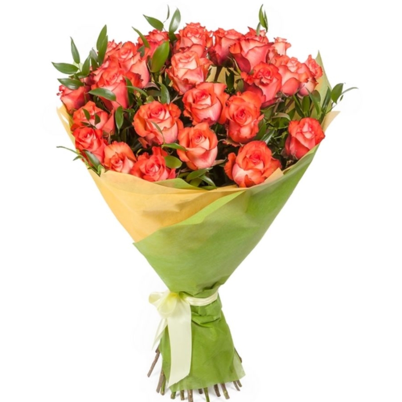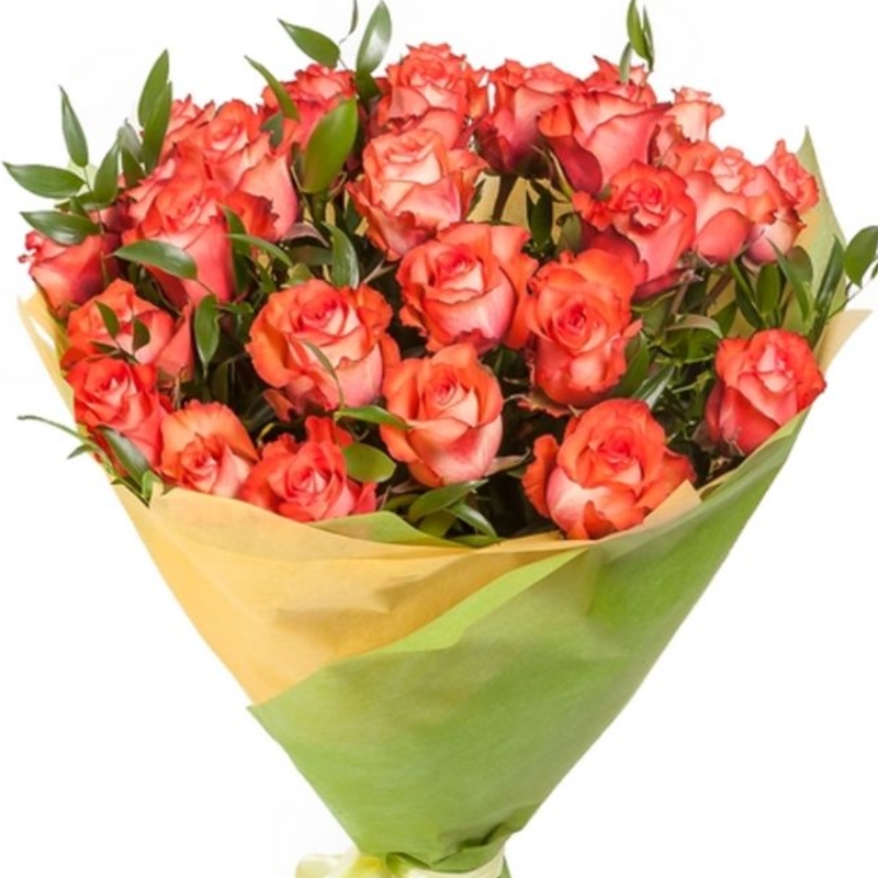 Букет состоит из 29 коралловых роз, зелень, красивая упаковка, атласная лента.