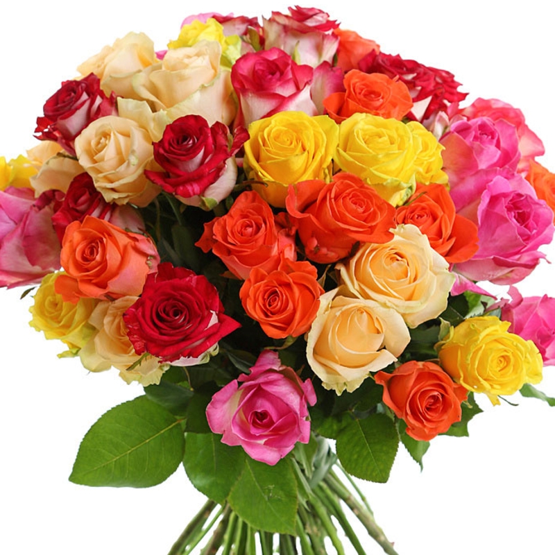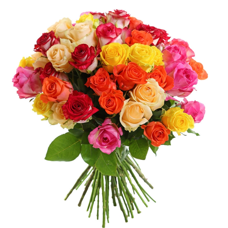 Букет состоит из MIX из 55 роз, прозрачная упаковка, атласная лента.