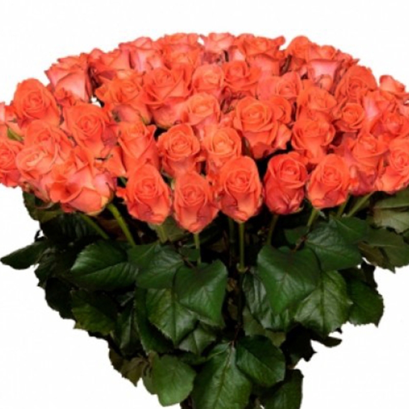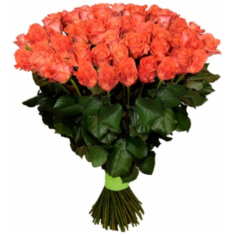 Букет состоит из 55 коралловых роз, прозрачная упаковка, атласная лента.