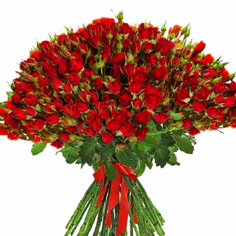 Букет состоит из 101 красная кустовая роза, прозрачная упаковка, атласная лента.