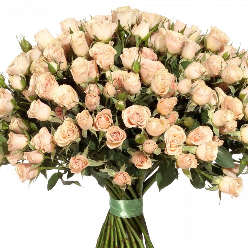 Букет состоит из 45 кремовых кустовых роз, прозрачная упаковка, атласная лента.