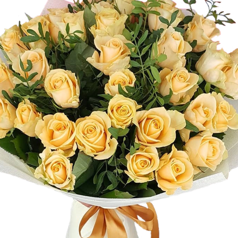 Букет состоит из 31 кремовая роза, зелень, красивая упаковка, атласная лента.
