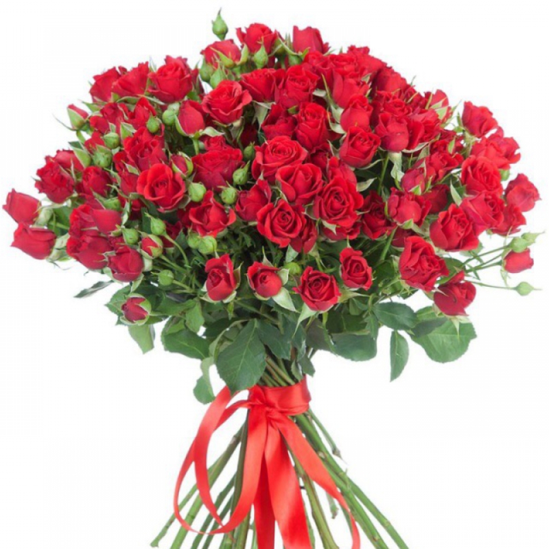 Букет состоит из 19 красных кустовых роз, прозрачная упаковка, атласная лента.