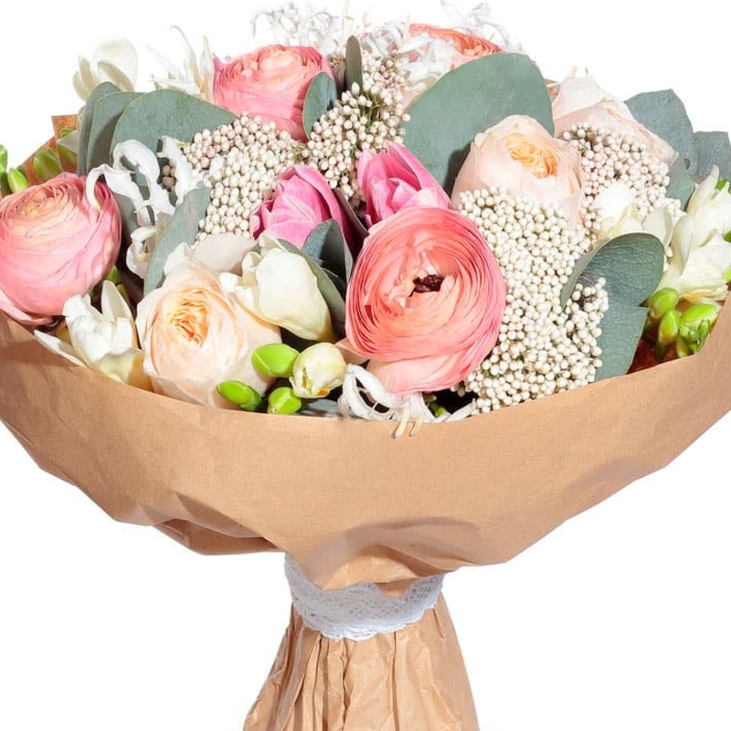 Букет состоит из 4 ранункулюса, 3 пионовидные розы, 7 веток фрезий, 3 цветка озотамнуса, эвкалипт, крафт, атласная лента.