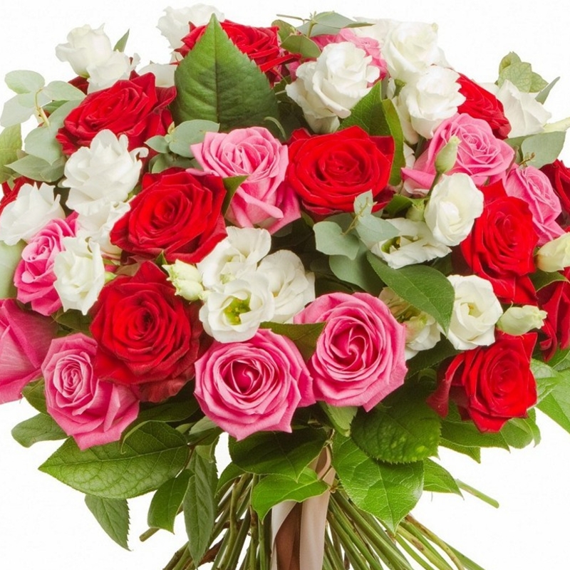 Букет состоит из 13 красных роз, 12 розовых роз, 10 веток эустомы, зелень, прозрачная упаковка, атласная лента.