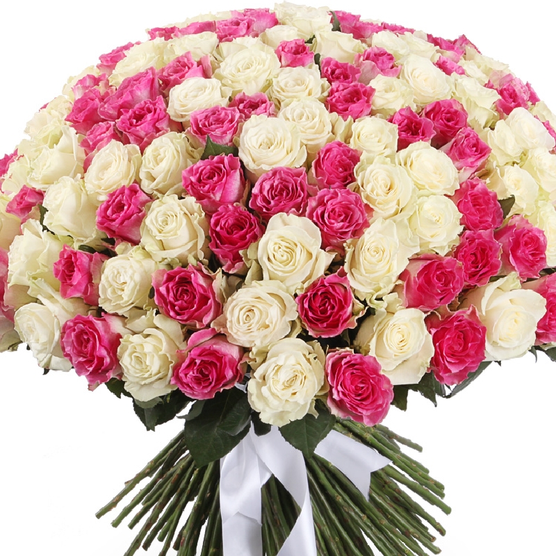 Букет состоит из MIX из 201 белой и розовой розы, прозрачная упаковка, атласная лента.