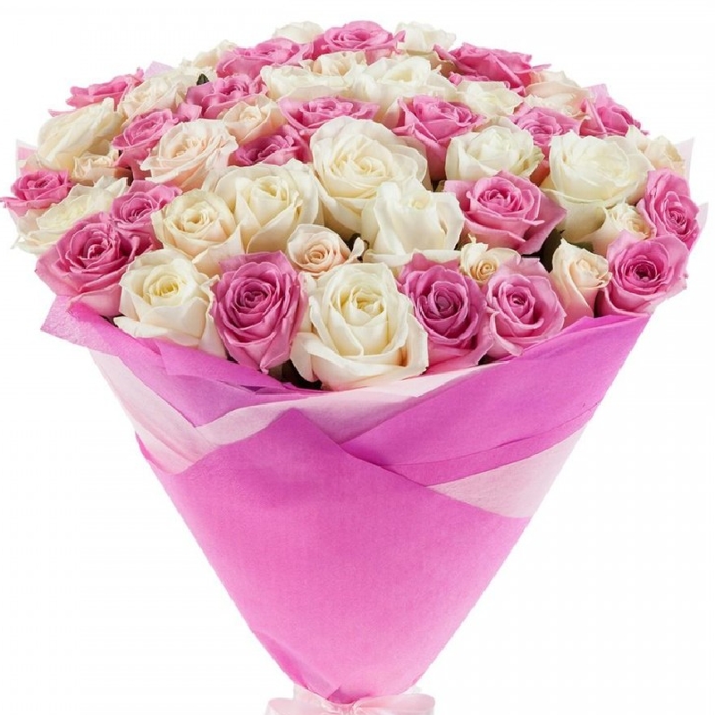 Букет состоит из 51 белая и розовая роза, красивая упаковка, атласная лента.