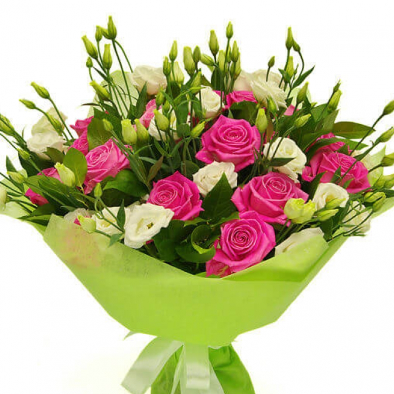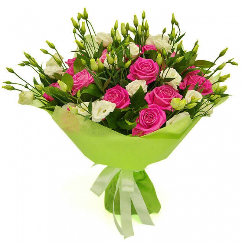 Букет состоит из 15 розовых роз, 8 веток эустомы, зелень, красивая упаковка, атласная лента.