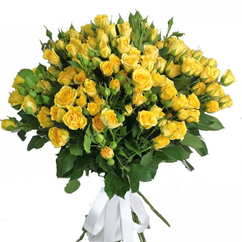 Букет состоит из 27 желтых кустовых роз, прозрачная упаковка, атласная лента.