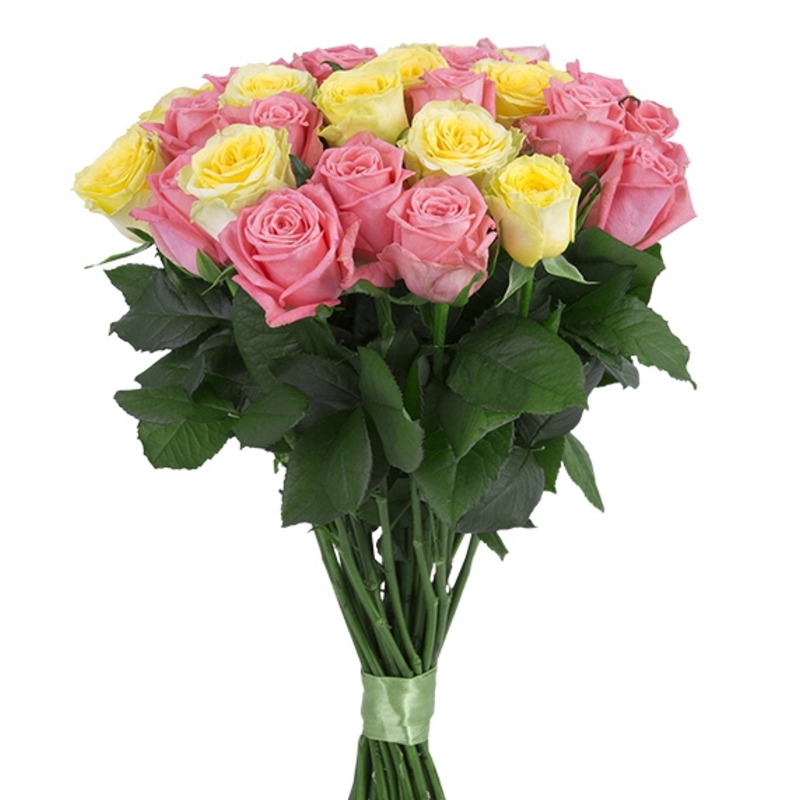 Букет состоит из 20 розовых роз, 11 желтых роз, прозрачная упаковка, атласная лента.