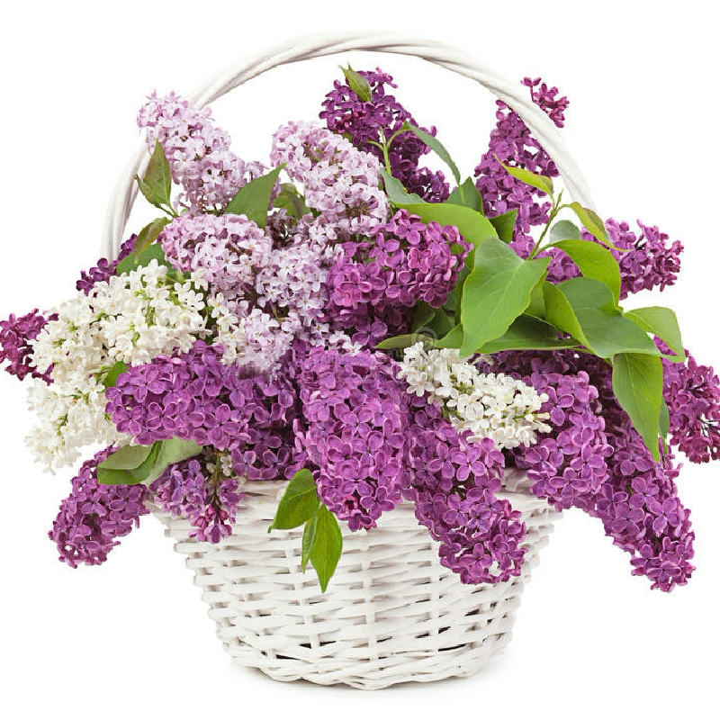 Букет состоит из 15 веток сирени, оазис, корзина.
